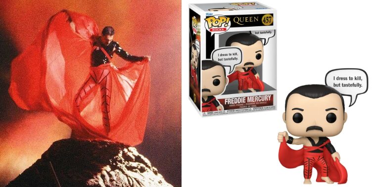 Freddie Mercury também ganhou lugar na nova versão de colecionáveis Funko POP!. Vestido com uma roupa vermelha e preta, vem com a frase “I dress to kill, but tastefully” (Eu me visto para matar, mas com bom gosto).